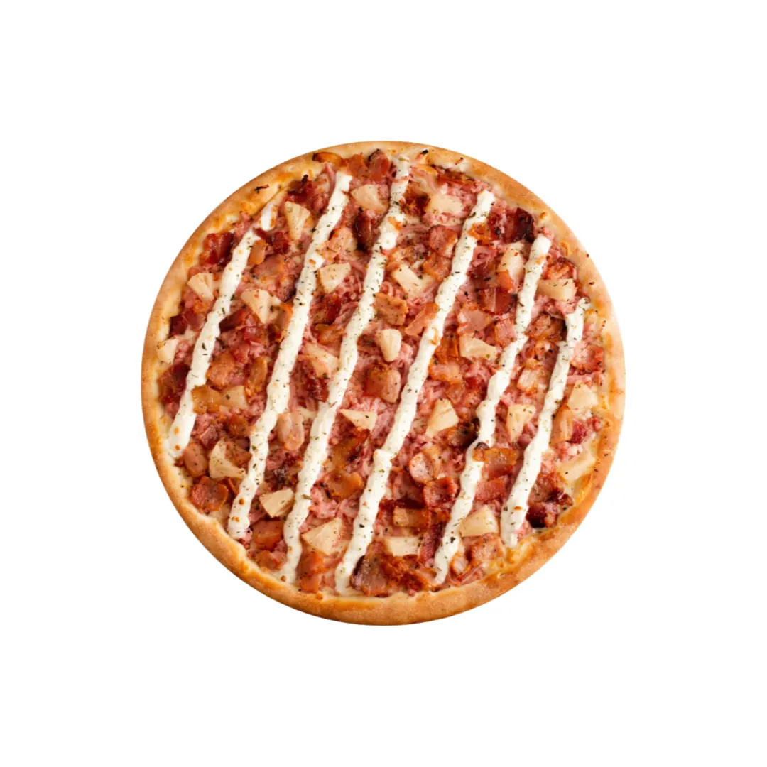 Molho de tomate, muçarela, bacon, ovos, calabresa, cebola e catupiry